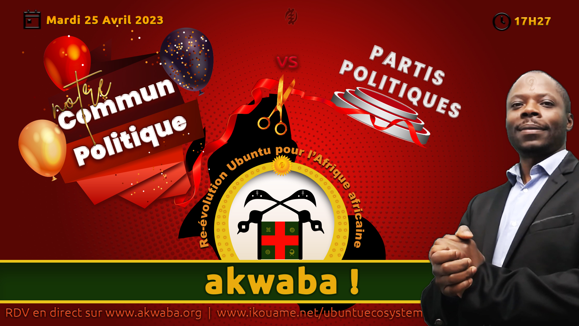 En attendant le plaisir de nous retrouver en direct live à partir 17H27, je vous invite à visiter notre site internet www.akwaba.org et à vous familiariser avec la notion de “commun politique”(https://www.akwaba.org/commun-politique). Prenez le temps nécessaire pour découvrir nos idées et notre démarche, et si vous voulez participer à la re-évolution positive de l’Afrique, rejoignez-nous : https://www.akwaba.org/je-veux-adherer !